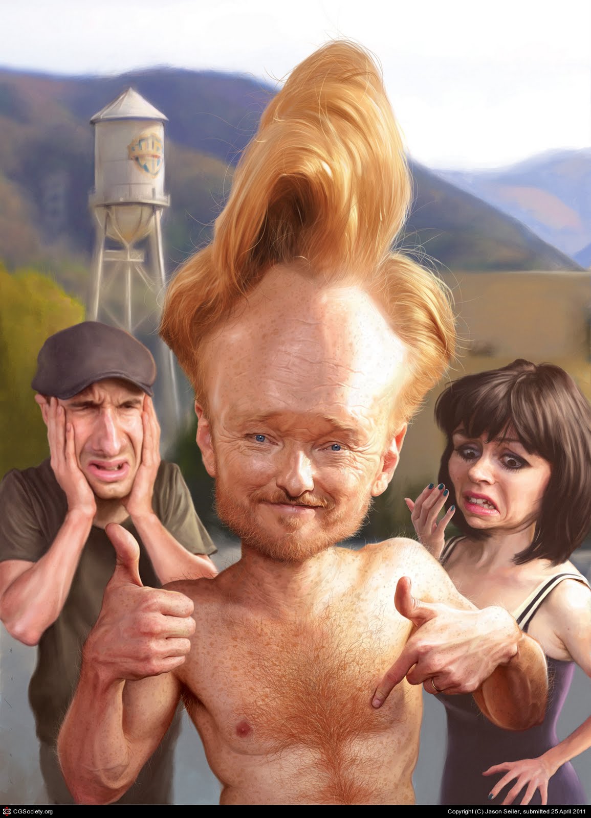 I've been a big fan of Conan O'Brien's for many years now. As most of you probably know, Conan has gone through a lot this past year and I personally feel it's for the best. His new show is better than ever and blows away the other late night shows. I wanted to create a new caricature piece for my portfolio so I decided to paint Conan. I wanted something that "felt" like his show, and something that I could imagine seeing on his show. My goal was to capture the spirit and character of the new Conan.