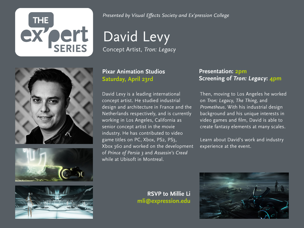 1_resizeDavid Levy - a leading international concept artist, one of the founders of Steambot studios wills be giving a talk next week in San Francisco at Pixar Animation Studios about the work done on Tron Legacy. This even is Presented by the Visual E!ects Society (VES) and Ex’pression College (The talk will be followed by a projection of Tron Legacy)