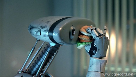 Andrieux reports that Legacy actually built two robots; "One robot, that we called 'The Puppet,' which could be puppeteered and could move its head and its body a little bit, but it couldn't walk or hold or grab anything. That's the robot we copied in CG. There was also an actor in a suit who walked and grabbed the burger, and acted out the story. So for some of the shots that were extreme close-ups, we used the puppet. But in all the other shots we needed to replace the neck, the elbows, the hands and so on, as you could see it was a man in a suit."