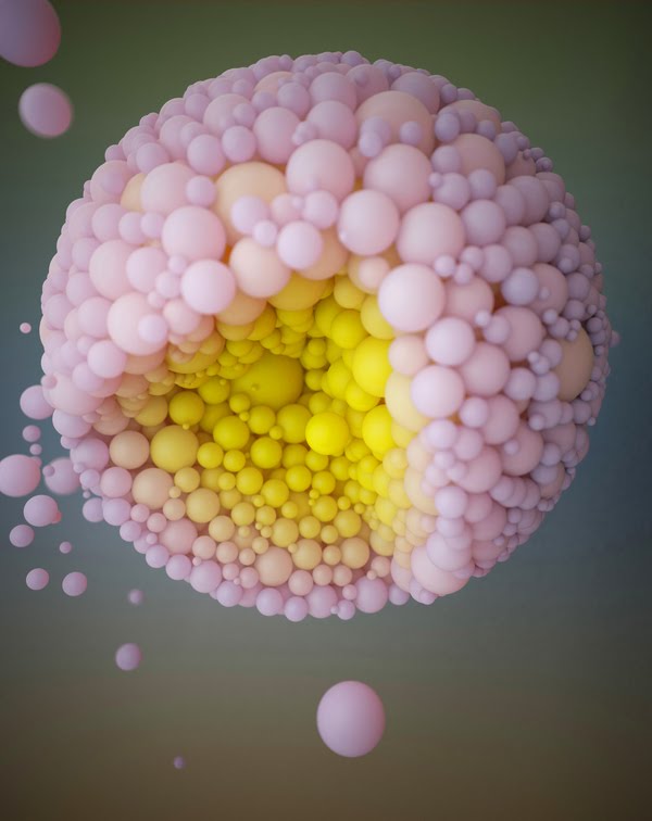 Intelligent particles, the size of dust grains, are programmed to fill nonexistent shapes (the mathematical problem of geometry packing). The "know" their relative position inside the imaginary form (i.e. distance from hull or center) and take on a color relative to it.