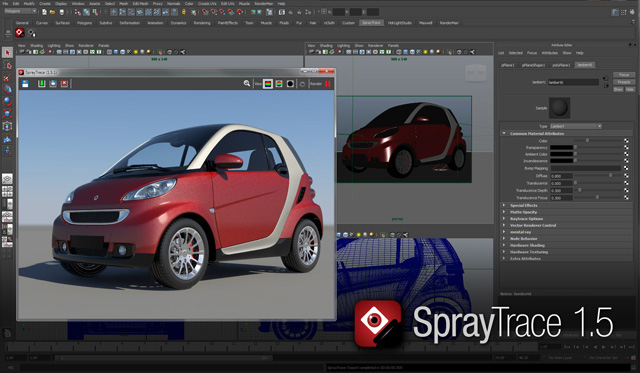 The SprayTrace plug-in for Maya provides a real-time progressive preview for mental ray scenes. With a single button press, SprayTrace launches a live connection to Maya, providing users with the ability to make informed decisions throughout the materials, texturing and lighting process.