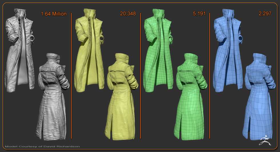 -ZRemesher - An evolution of ZBrush's automatic retopology tool brings this process to a new whole level. It analyzes the curvature of your mesh to produce a very natural polygon flow. Yet it also achieves these better results in significantly less time. Of course, when you want more control you will also find features such as local density management and curve flow orientation. Furthermore, a new and innovative feature of ZRemesher is its ability to perform local retopology to a specific part of your mesh while keeping all border vertex points welded with your existing model. See ZBrush 4R6 ZRemesher overview video by Ryan Kingslien from ZBrushworkshops.com