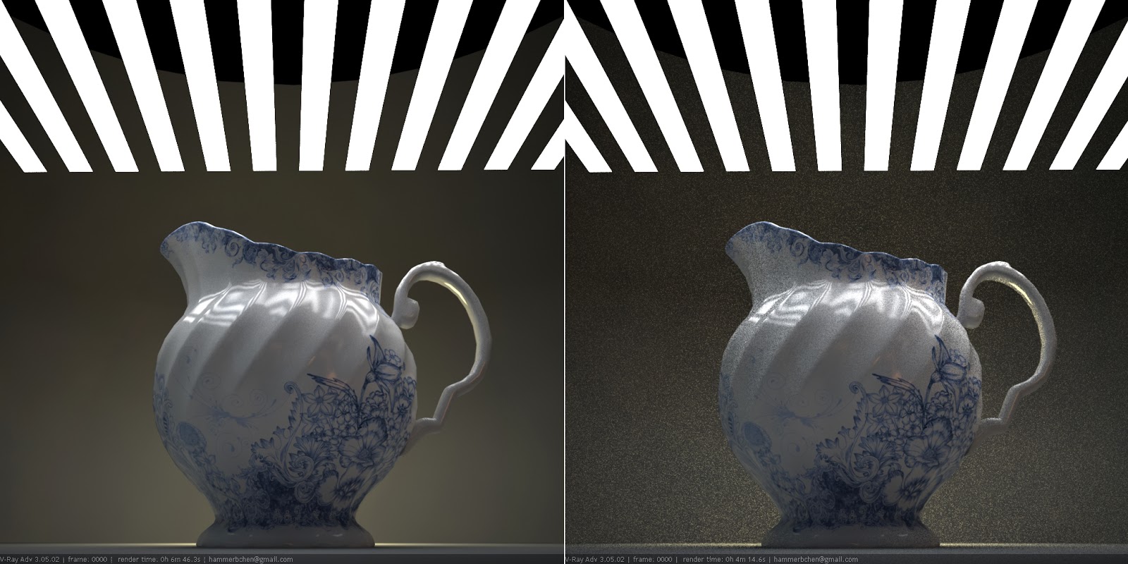Although with the same setting, V-Ray 3.0 beta rendering is slightly noisier than V-Ray 2.4, but the rendering time is significantly reduced by 40.8%.