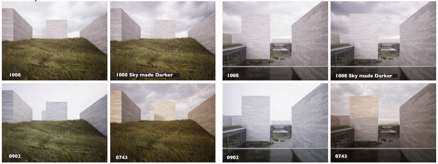 LIGHTING & MOOD - Possible sky set-up alternatives. I’m actually leaning more and more towards using 0902 (the numbers refer to different HDRi skies that he uses). He really likes how the abstract forms of the concrete galleries are strong against the sky, and he thinks it works best with the fog.