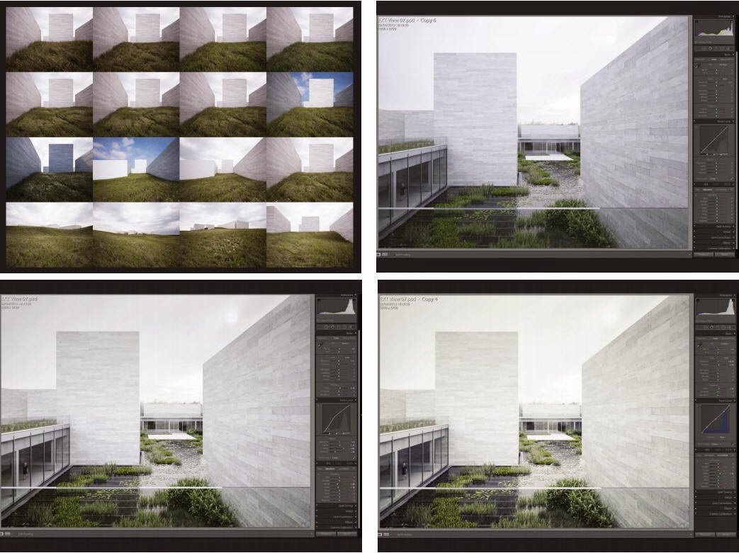 Finally there was a process of choosing final views and then further refining them until everyone was happy. He used rebusfarm to render the final views as each render took about 10-20 hours on his one machine. Unusually, there was very little photoshop work, apart from comping in the occasional person. Most final grading was done in Lightroom. Lightroom also serves as a handy final step for him to keep alternative versions (crops, b&w) linked to the final PSD in a library from which you can quickly export JPGs for different purposes.