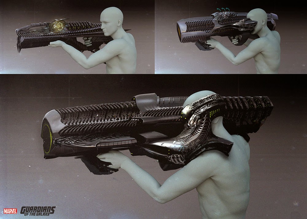 Towards the end of 2012 I got contacted by MPC to work on VFX and visual development of Guardians of the Galaxy. In collaboration with folks at MPC I worked on weapon designs. Most of the Badoon concepts are direct collaboration and often times based on original backdrop from talented artists David Hobbins and Goran Bukvic. The nuclear weapon used by Star-Lord in the movie was created in collaboration with Jama Jurabaev and 3d artists at MPC.