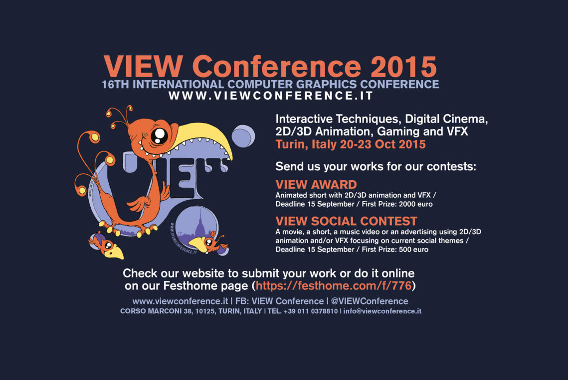The VIEW Award competition is held as part of the 2015 VIEW Conference, the largest international computer graphics conference in Italy. The 2015 VEW Conference will be held in Turin October 19-23, preceded by VIEWFest running October 16-18.