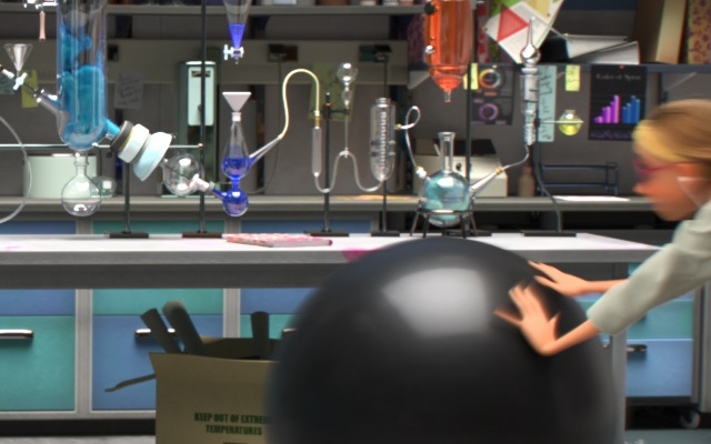 Here a close-up of the Big Hero 6 team lab rendered with and without Honey Lemon rolling in the explosive ball. Note the subtle influences she has on the look of the lab environment thanks to the accurate simulation of light: