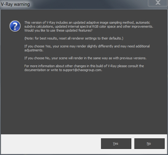 If you choose YES, your scene may render slightly different, may need some fine-tuning. Choosing "NO" your scene will render same as previous version. For optimized performance, reset your render settings by setting to default scanline and set back to V-Ray renderer. By doing this you can have a clean default settings. Choosing "YES" actually change many parameters that scattering throughout the UI. As describe on this thread of Chaos Group forum: "Old 3.2 / new 3.3 behavior switcher", you are able to switch between the old settings and new one by runing a maxscript. The following are the script for V-Ray 3.3 ( two level adaptive, sRGB color space and dynNoiseThreshold  can not be found in the UI)