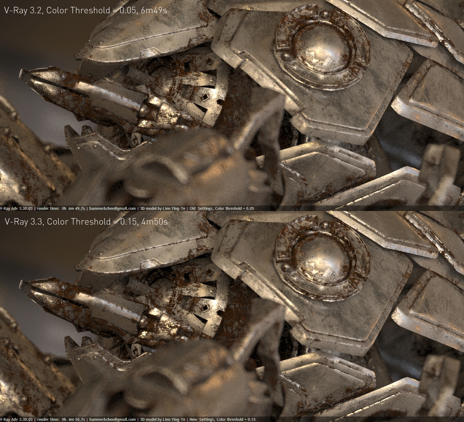 Based on initial test results, I found with Color threshold = 0.15,  I can get good noise level within a reasonable time. The upper image shows the V-Ray 3.2, Color Threshold = 0.05; lower image shows V-Ray3.3, Color Threshold = 0.15. Therefore, with similar image noise level, V-Ray3.3 reduce  rendering time by 29%.