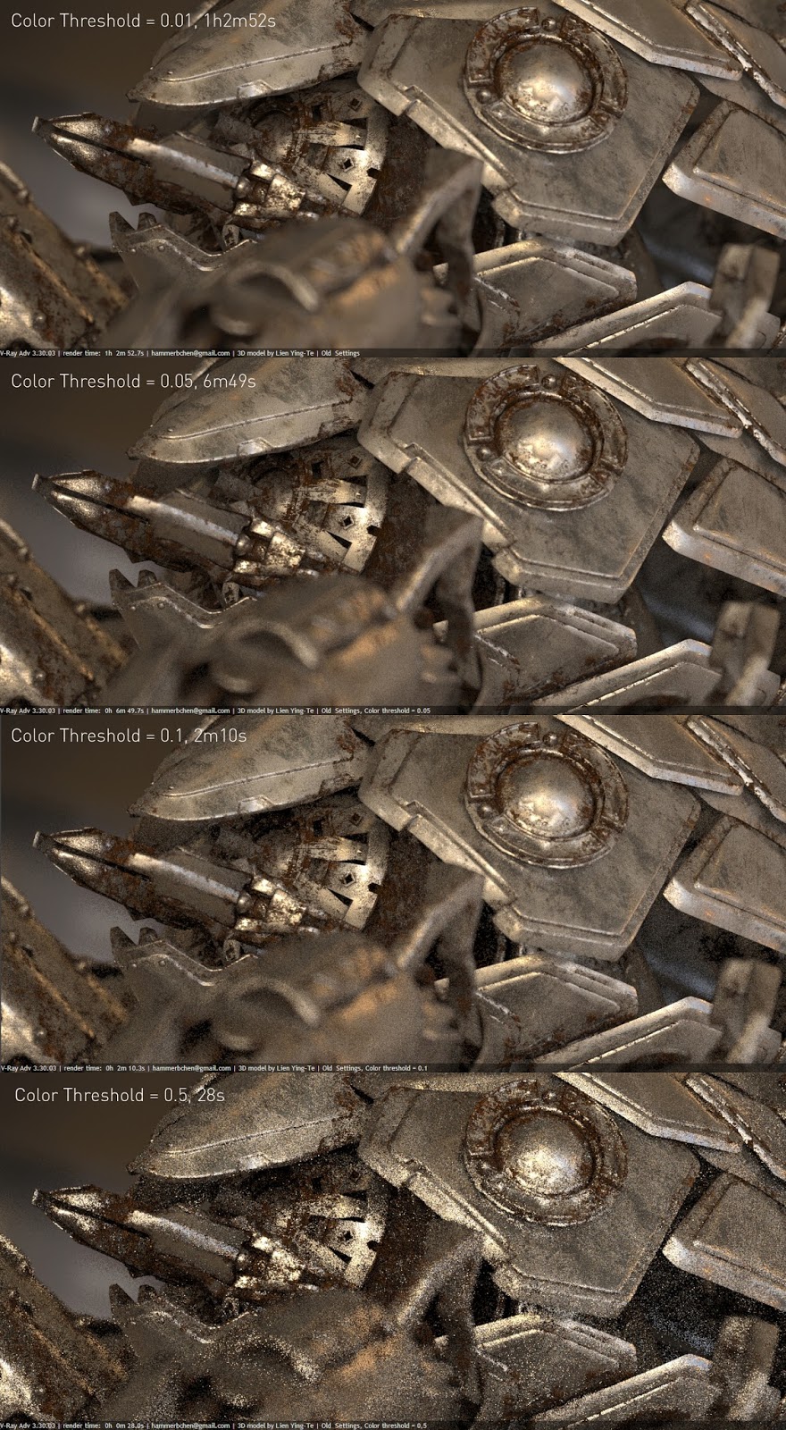 To make the procedure even more simpler, I only change "color threshold" in this case. Here are my test results when rendering with V-Ray 3.3 new settings:
