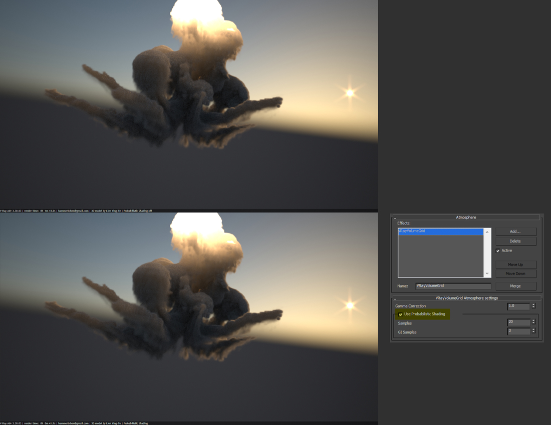 Here I use FumeFX to simulate the explosion, output the cache sequence as Field3D. This open format can be read by VRayVolumeGrid.  With "Probabilistic Shading" checked render faster (from 1m 18s , down to 41s, reduce rendering time by 47%)