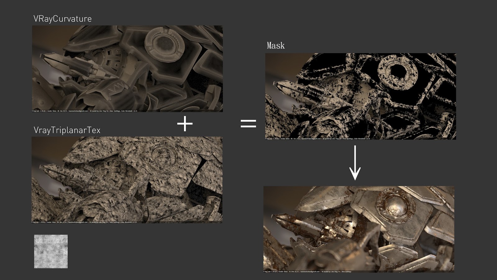 • VrayTriplanarTex is able to produce triplanar mapping of any other 2D texture over an object that doesn't have UV coordinates. This feature has great potential. Combined with VRayCuravature is perfect for geometry sensitive mask ─ which is the key element for realistic material.