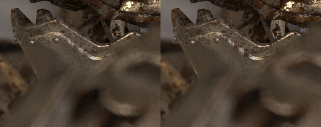 V-Ray 3.2 (left) shows more white noise than V-Ray 3.3 (right) in the dark area.