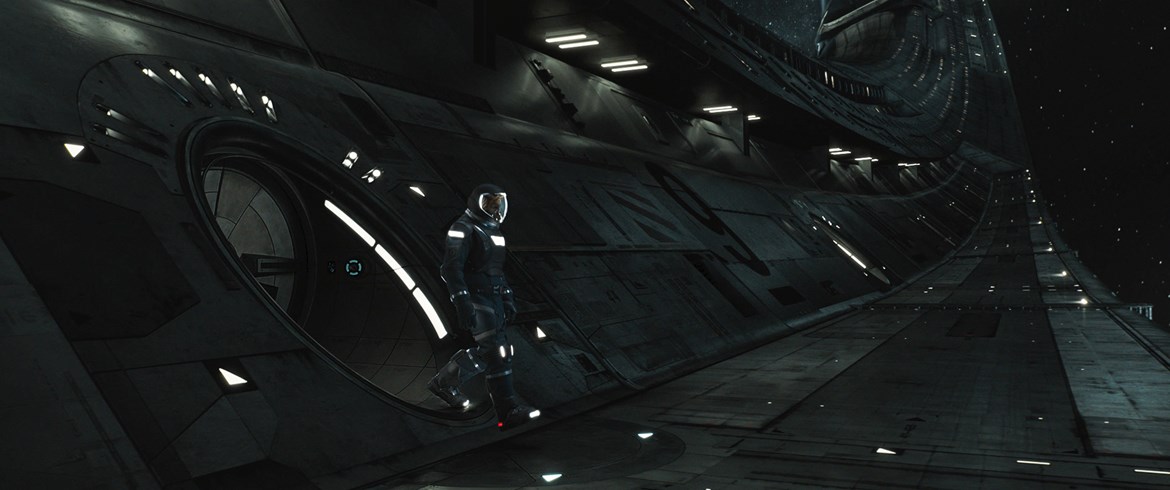 Bringing the 1,000m long space-cruiser Avalon to the screen required a huge digital build. MPC inherited the design for Avalon from Production designer Guy Dyas. MPC’s artists then began work building a digital version of the ship and adding detail to the design. Several digital versions were created to support the varying levels of fidelity required throughout the film. A relatively lightweight model was used for animation blocking and first pass lighting tests. This ship was then up-textured and covered with additional small details to help with scale. Finally, an art-directed pass of additional matte-painted texture would be used when the camera focuses on specific areas. MPC created set extensions and full CG environments for the environments within the ship including the grand concourse, crew hibernation area, gardens, entertainment areas, elevators, the engine room and more.